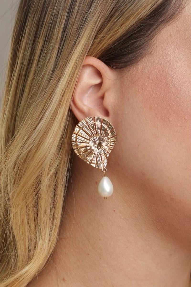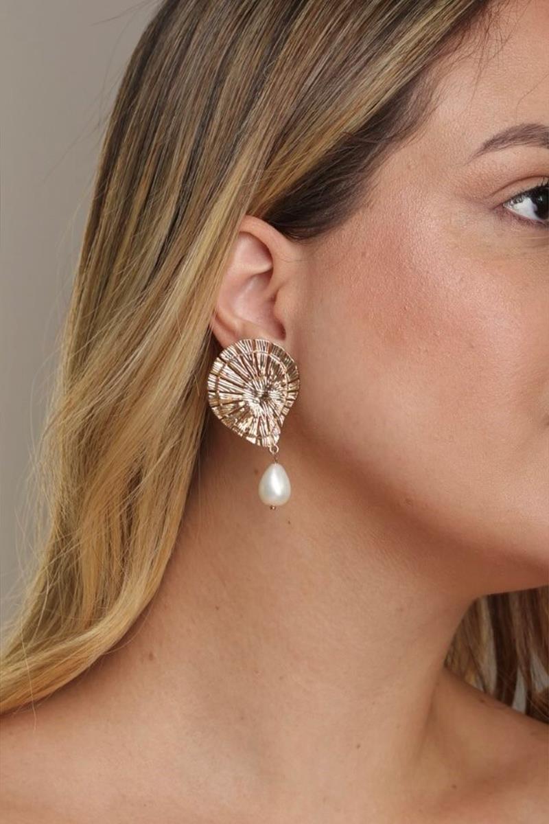 O Brinco Pérola do Sol é uma peça statement que une a imponência do design moderno com a suavidade atemporal da pérola. Seu formato em leque dourado com acabamento texturizado cria um efeito de brilho que lembra os raios solares, enquanto a gota de pérola pendente traz equilíbrio, feminilidade e requinte.