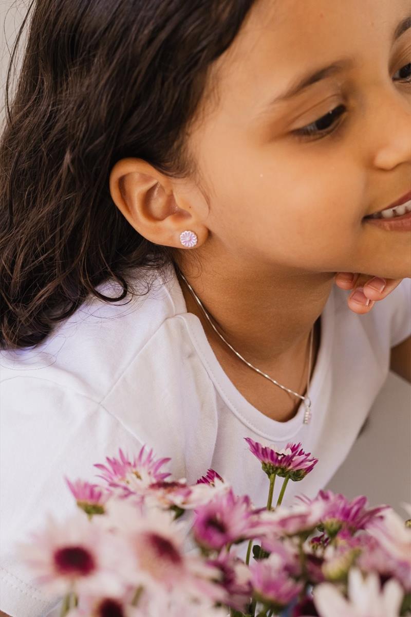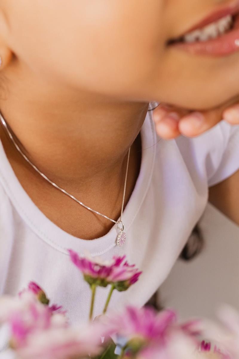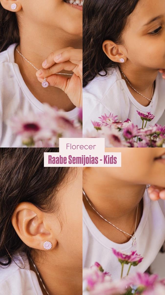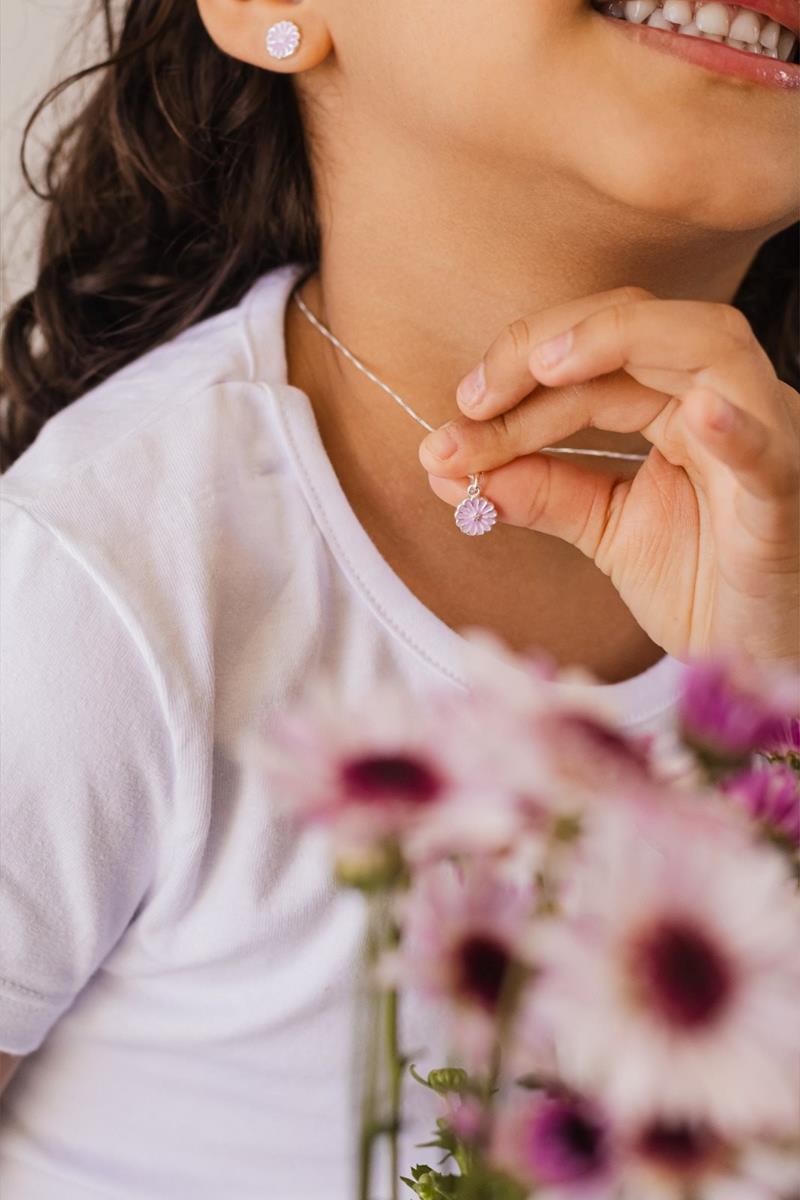 Conjunto infantil de colar e brincos com pingente de margarida lilás esmaltada, perfeito para crianças que amam brilho e cor com um toque de delicadeza.