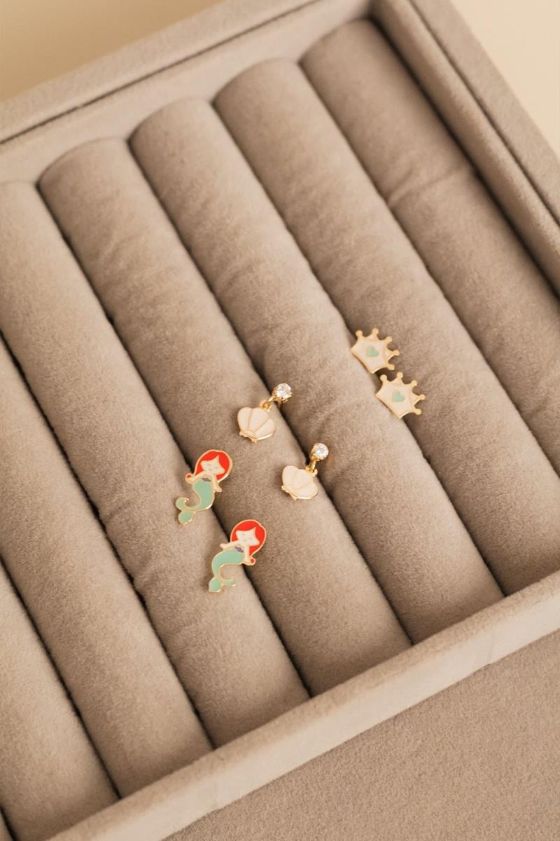 - Design Exclusivo: Inclui três adoráveis brincos em forma de concha, coroa e sereia, que trazem um toque de fantasia ao visual.