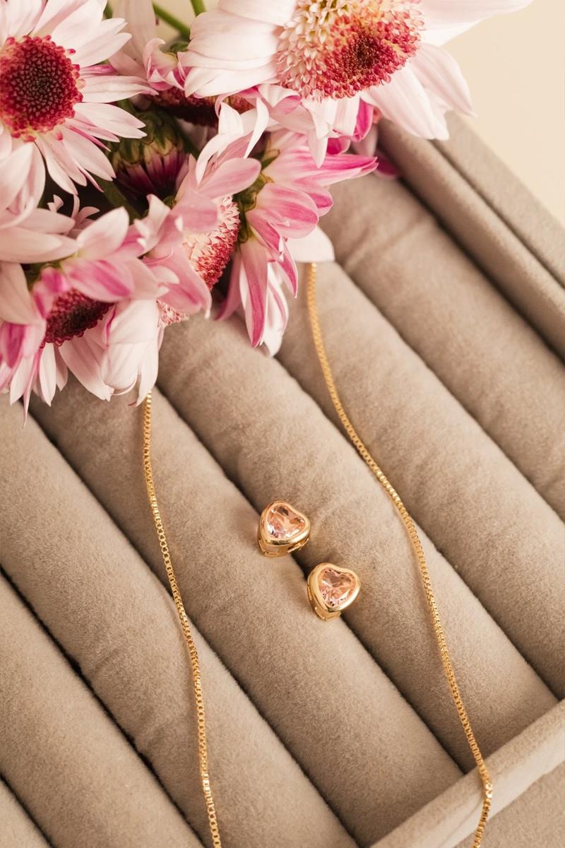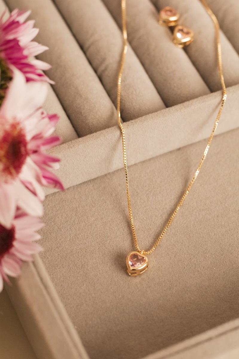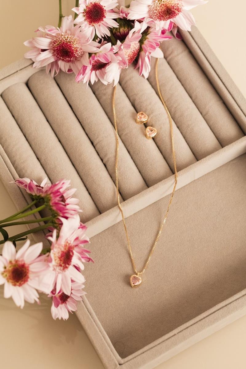 Brilhe com elegância e delicadeza: o conjunto de colar e brincos Cor, com pingentes de coração em pedra rosa, é o toque perfeito de sofisticação para o dia a dia da sua princesa ou para ocasiões especiais."
