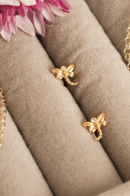 Brinco pequeno em formato de libélula, banhado a ouro 18k, com detalhes em zircônia cristal que adicionam um toque de brilho delicado. Leve, confortável e super versátil. por ser um brinco pequeno é ótimo para usar em segundo ou terceiro furo em adultos.
