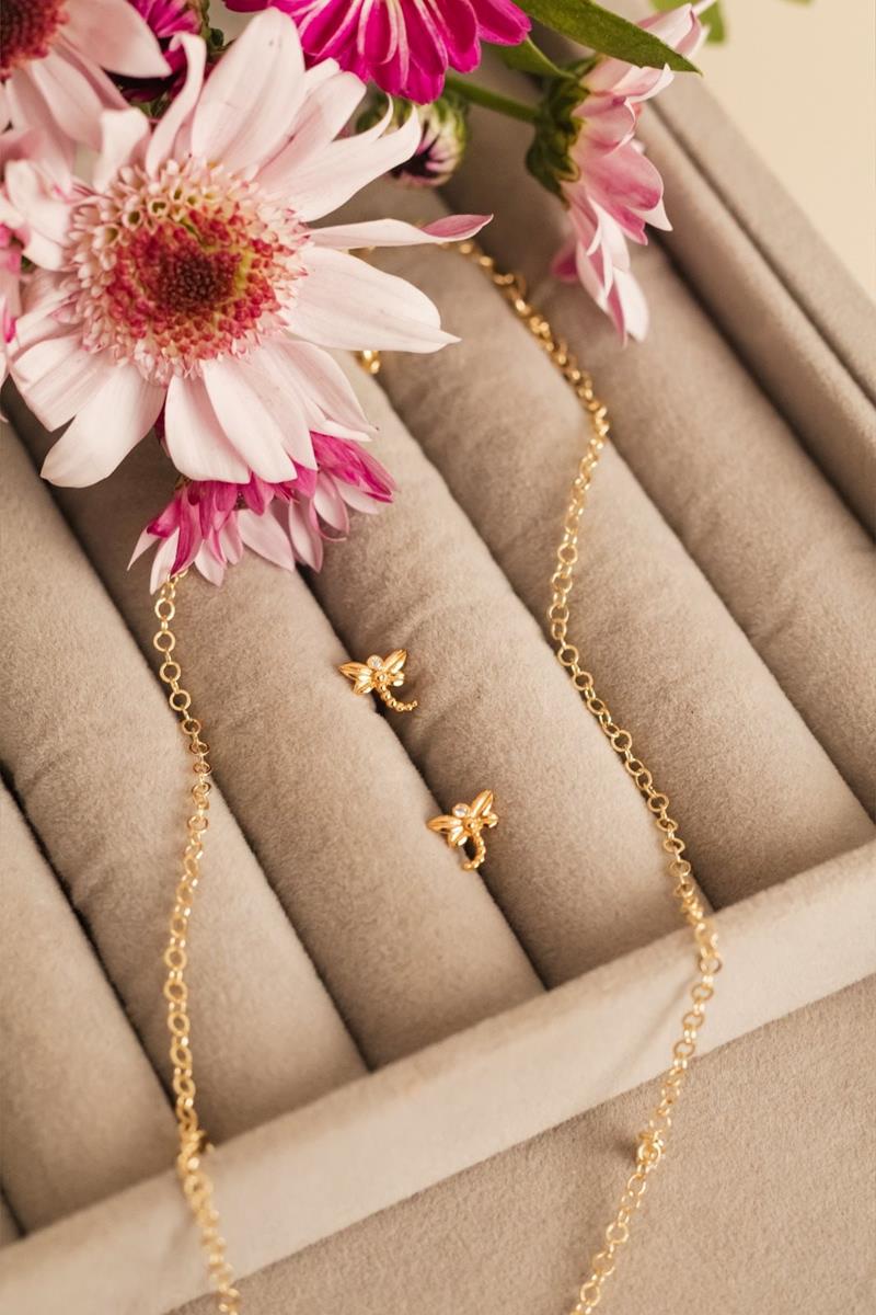 "Delicadeza que encanta: desperte sua essência com o brilho dourado da Libélula."