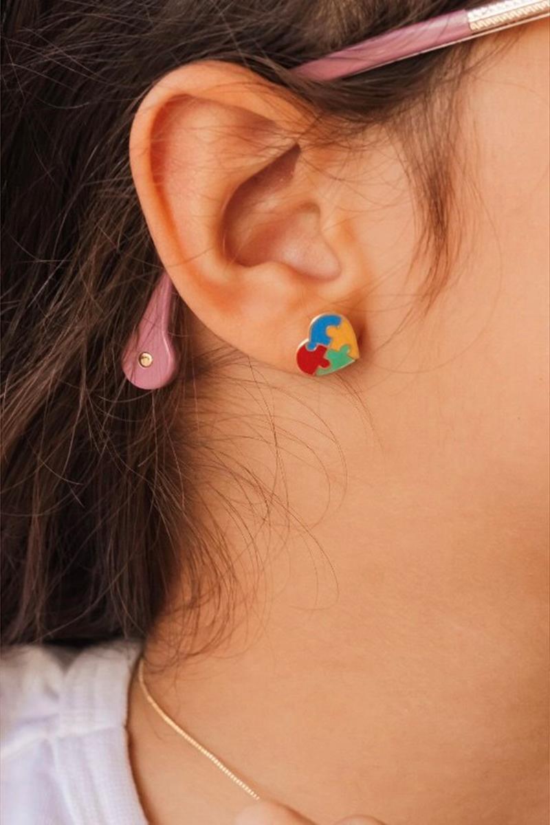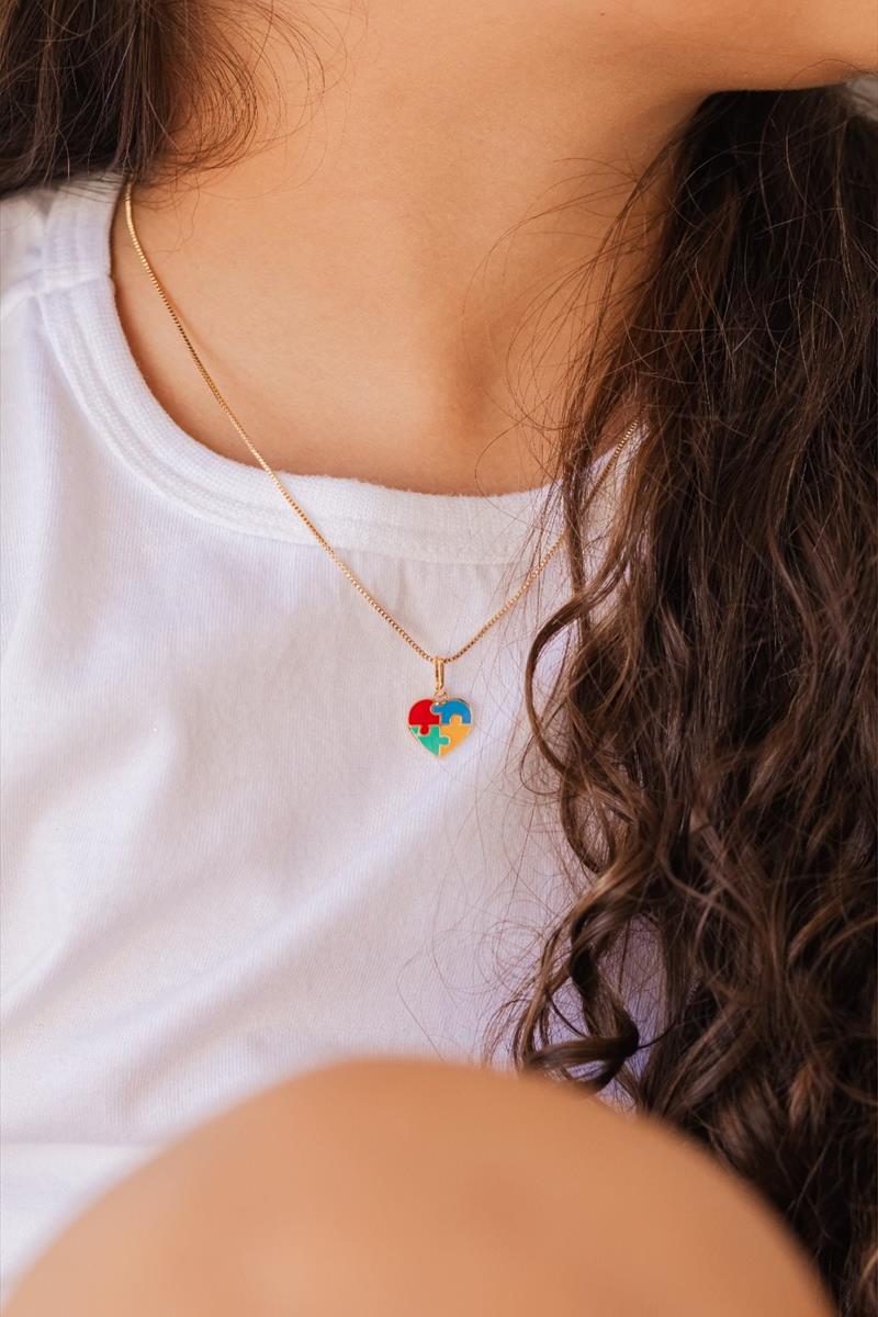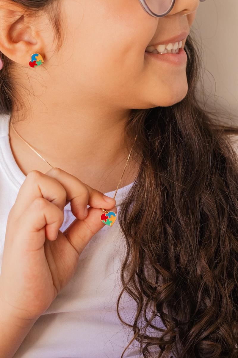 Conjunto com pingente em forma de coração e brincos combinando com um design colorido de peças de quebra-cabeça, representam a Conscientização e Aceitação do Autismo . As peças coloridas do quebra-cabeça simbolizam a diversidade e a complexidade do espectro autista, enquanto o coração representa amor, compaixão e apoio a indivíduos com autismo.