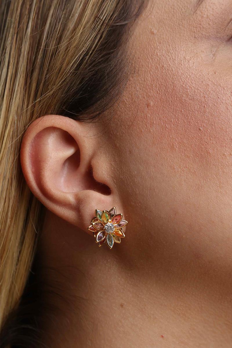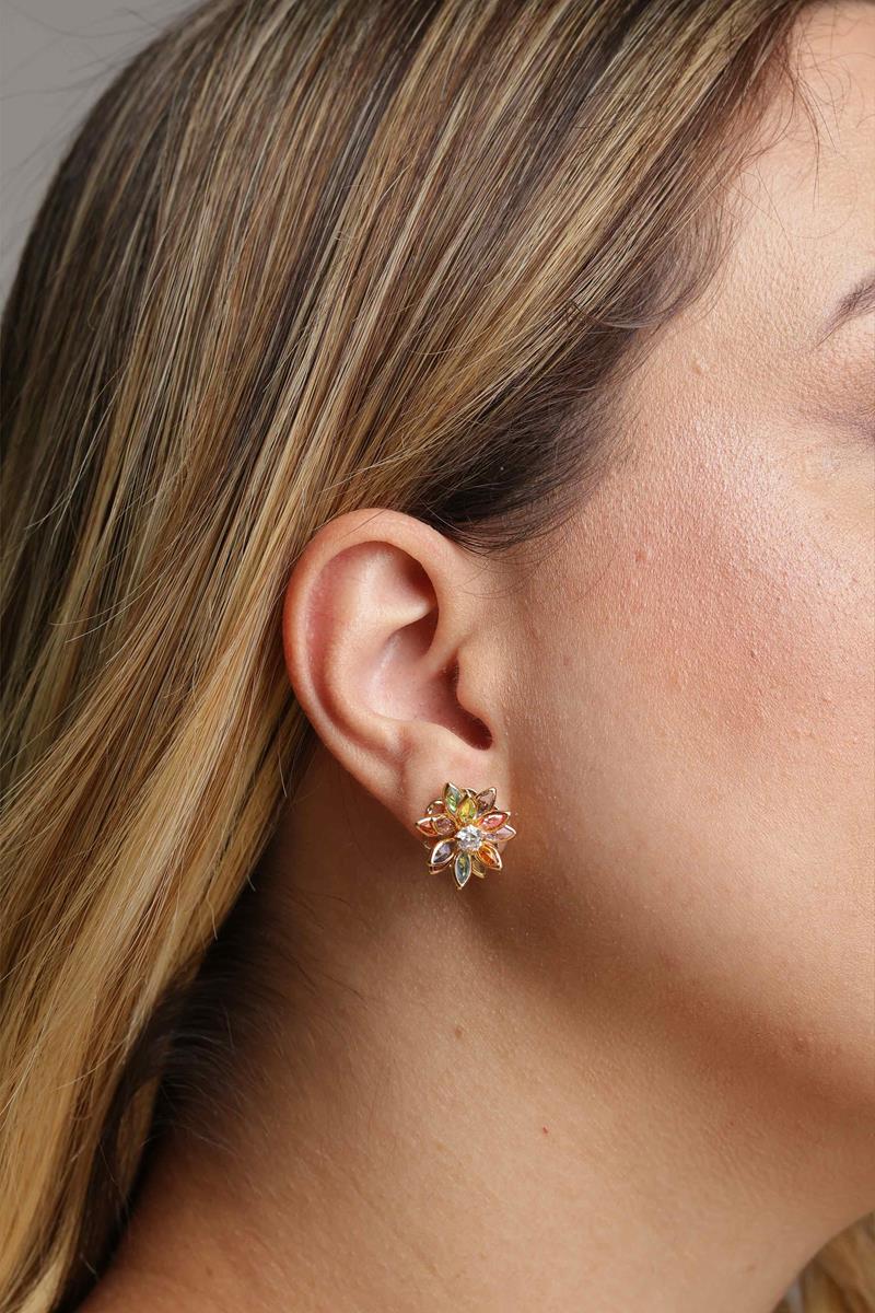 Brinco em formato de flor com pétalas de zircônias coloridas, banhado a ouro 18k. A combinação de tons vibrantes com acabamento delicado transforma essa peça em um acessório alegre, moderno e cheio de personalidade. Ideal para quem ama cor e estilo em um só detalhe!