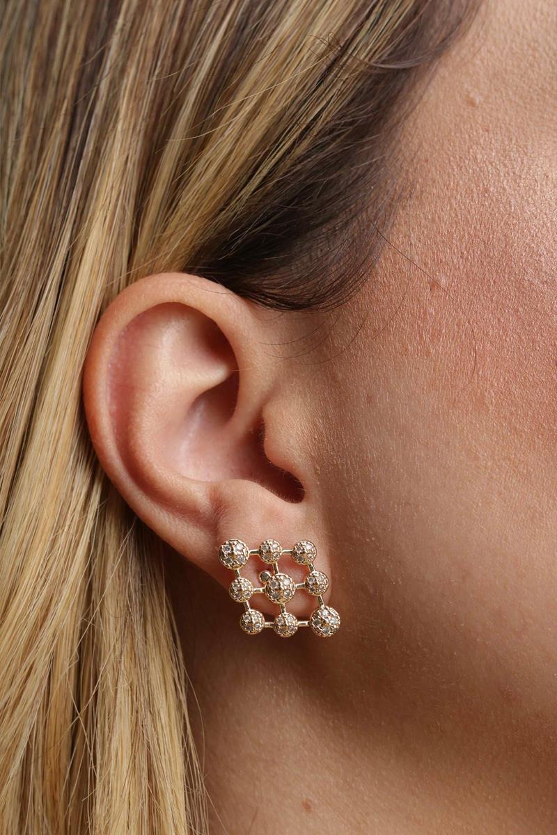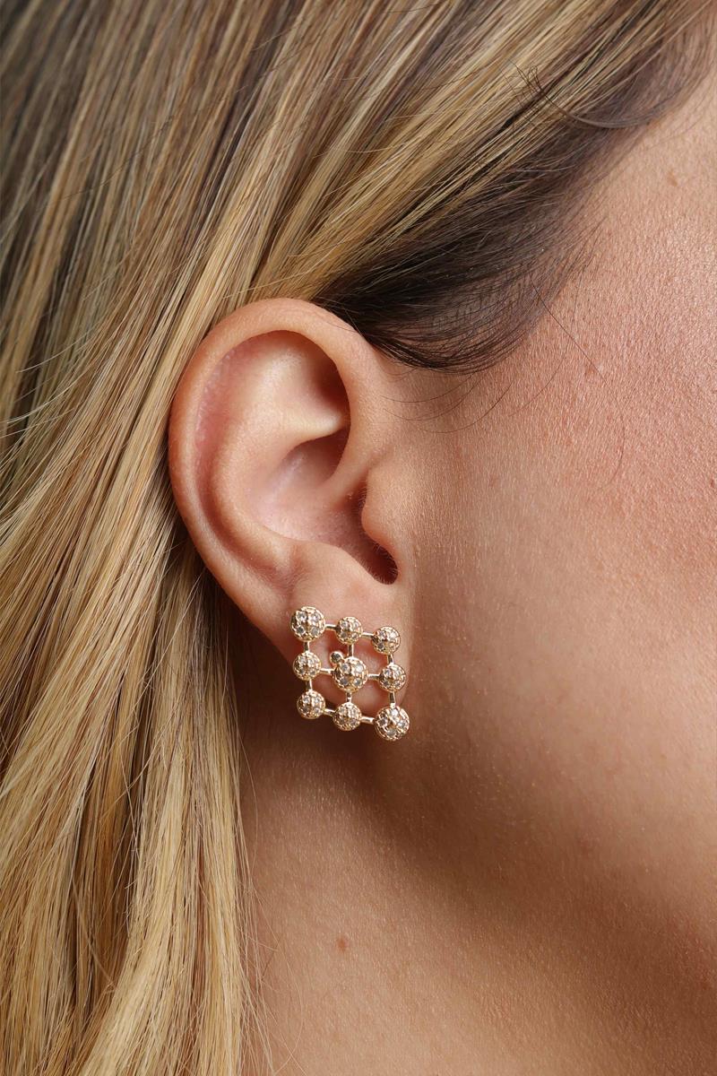 Esse brinco combina sofisticação com design contemporâneo. Sua estrutura geométrica quadrada é composta por pequenas esferas cravejadas com zircônias que refletem a luz com delicadeza.