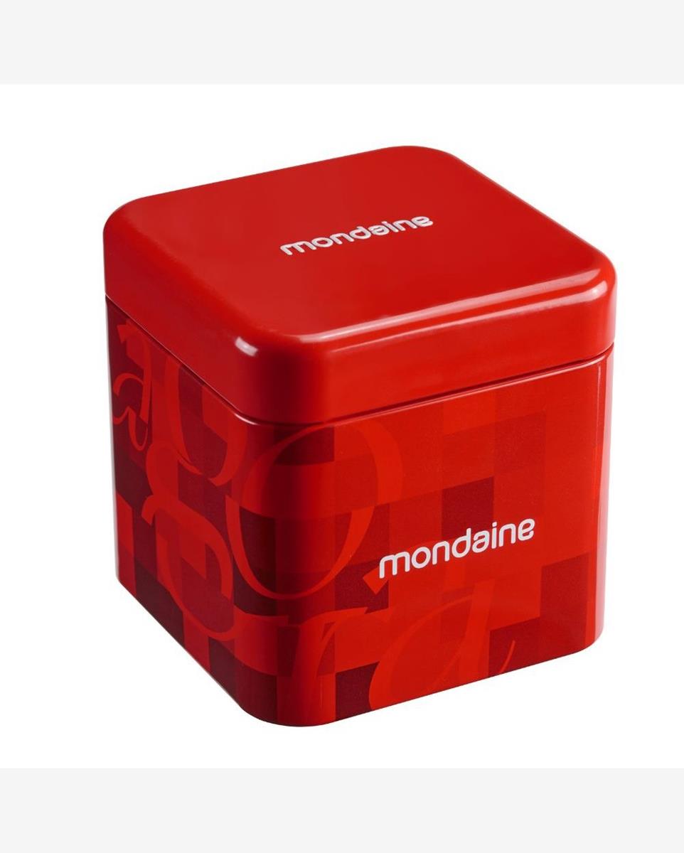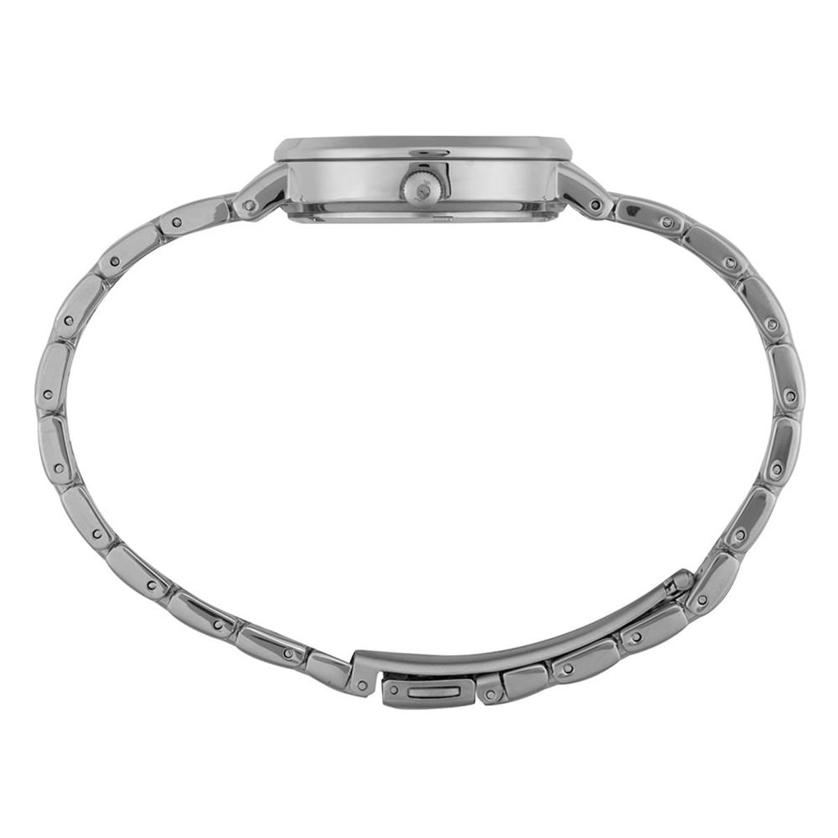 A caixa de 33mm em metal prata e pulseira sólida compõem um visual delicado e atemporal.