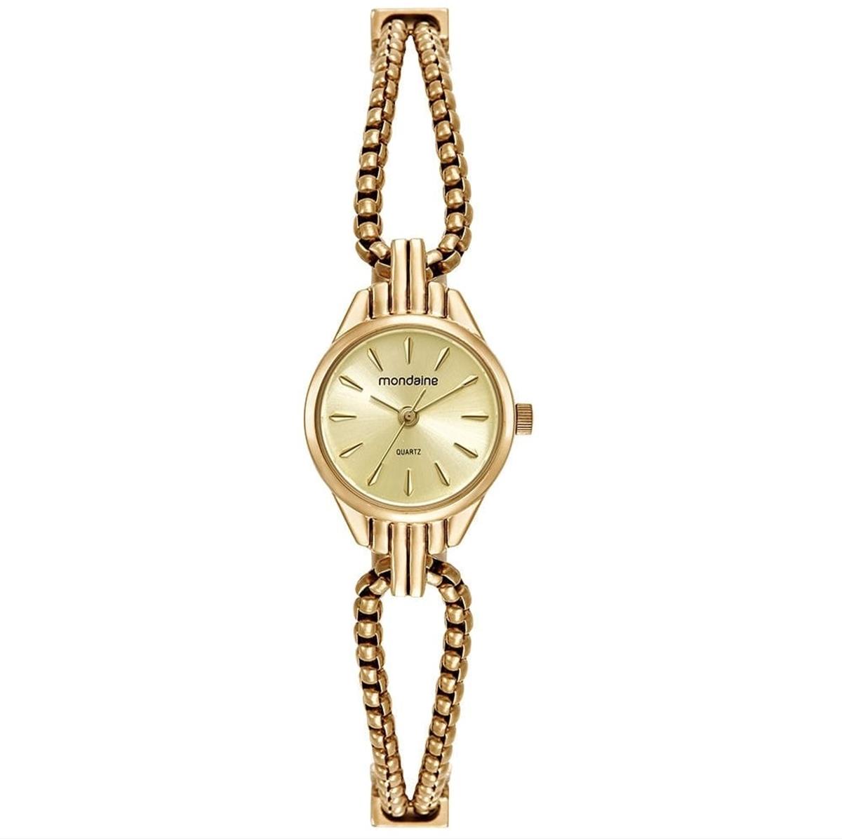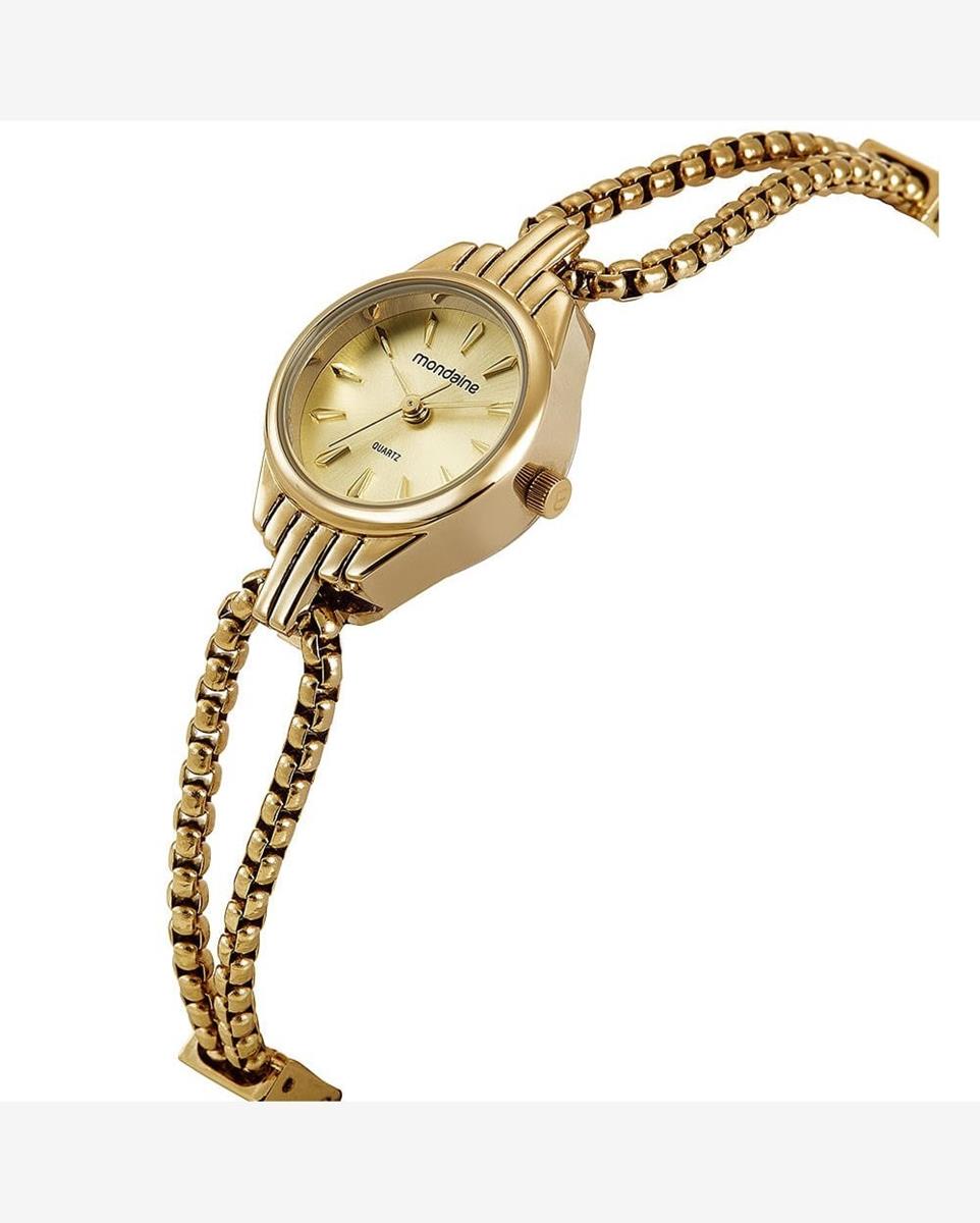 Este relógio Feminino Mondaine é a definição de elegância e sofisticação clássica. A caixa redonda de metal dourado tem 20mm de diâmetro, um tamanho delicado e muito feminino. O mostrador analógico em tom champagne adiciona um charme especial, com marcação em index completo.