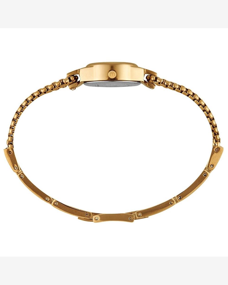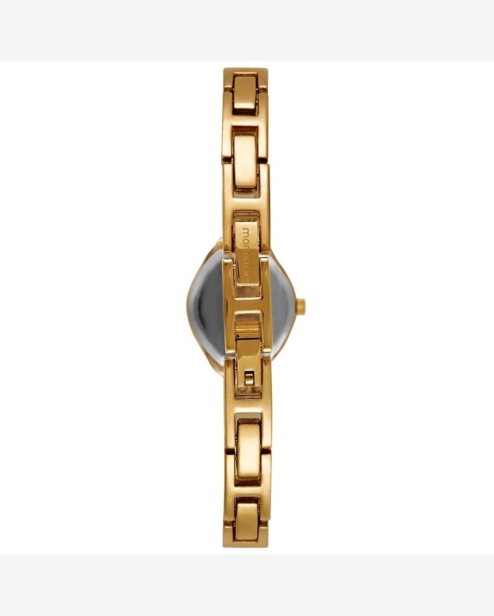 A pulseira de aço dourado confere um visual refinado e garante alta durabilidade à peça. O fecho em aço é prático e seguro para o uso constante. O relógio conta com fundo de pressão e resistência de 3 ATM, protegendo contra leves contatos com a água.