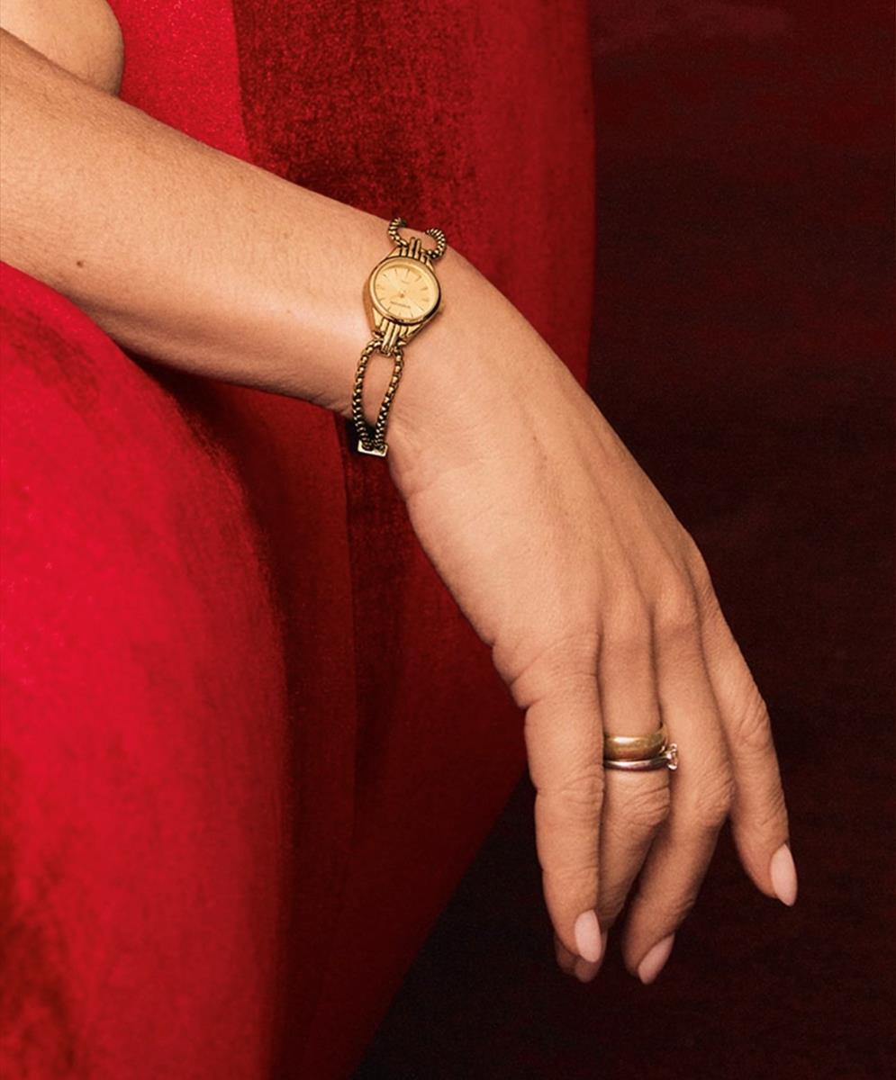 Um acessório versátil que transita perfeitamente do dia para a noite. O acabamento "all golden" com mostrador champagne é luxuoso e atemporal. Um Mondaine perfeito para mulheres que apreciam peças clássicas, delicadas e sofisticadas.
