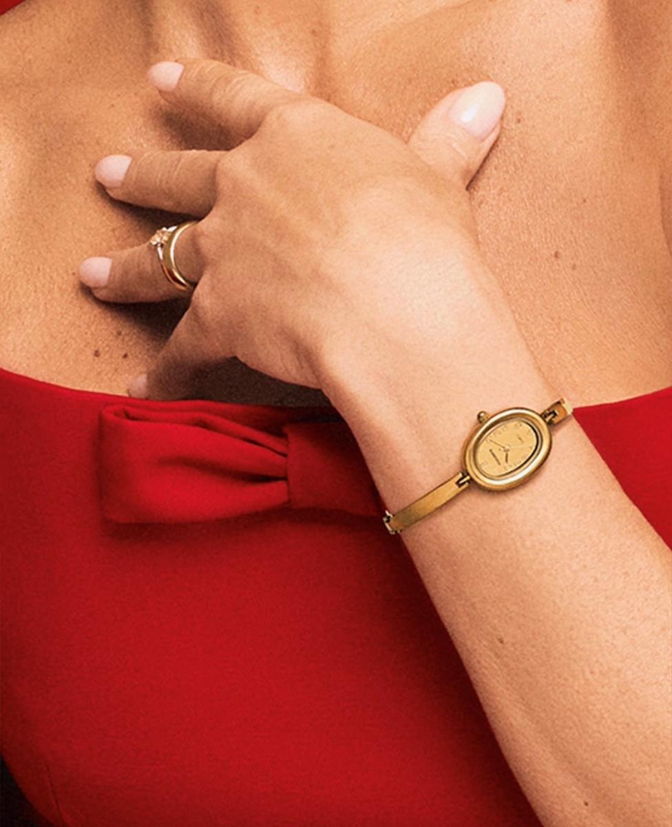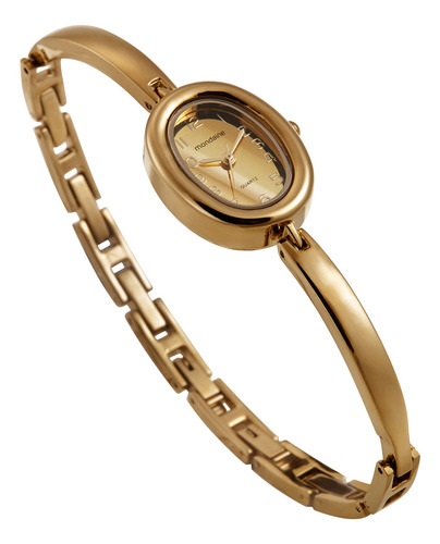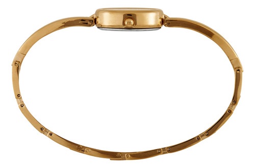 A pulseira rígida em forma de bracelete, complementando o estilo sofisticado. Com uma caixa de 2,3 cm de diâmetro, este relógio analógico ostenta uma elegante folheação dourada, conferindo-lhe um toque de luxo.
