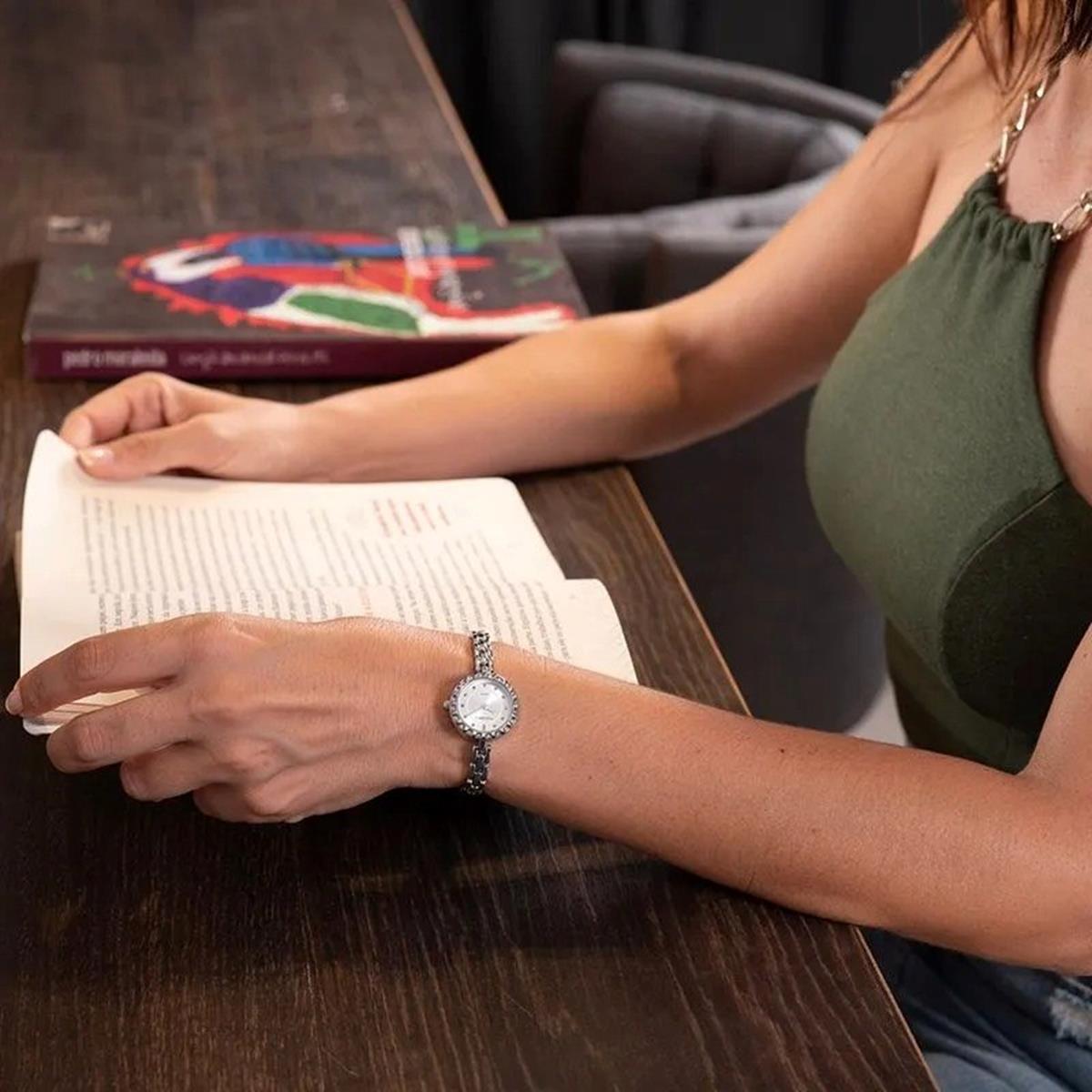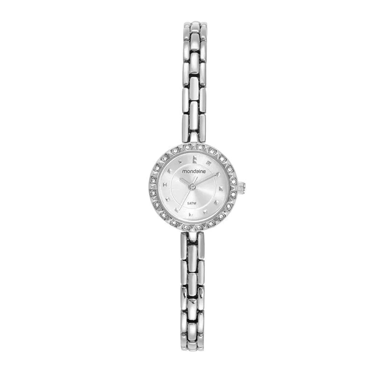 Relógio clássico e elegante com folheação prata e cristais na caixa. Sua pulseira é fina e delicada com estilo joalheria. Esse relógio possui a caixa em 2,2 cm de tamanho.