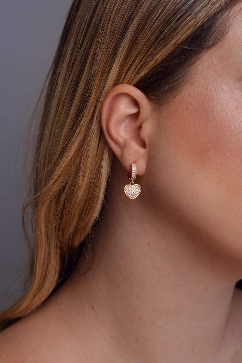 Adicione um toque de romance ao seu look com o nosso delicado brinco de coração, cravejado em Zircônia.