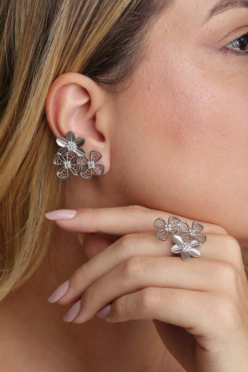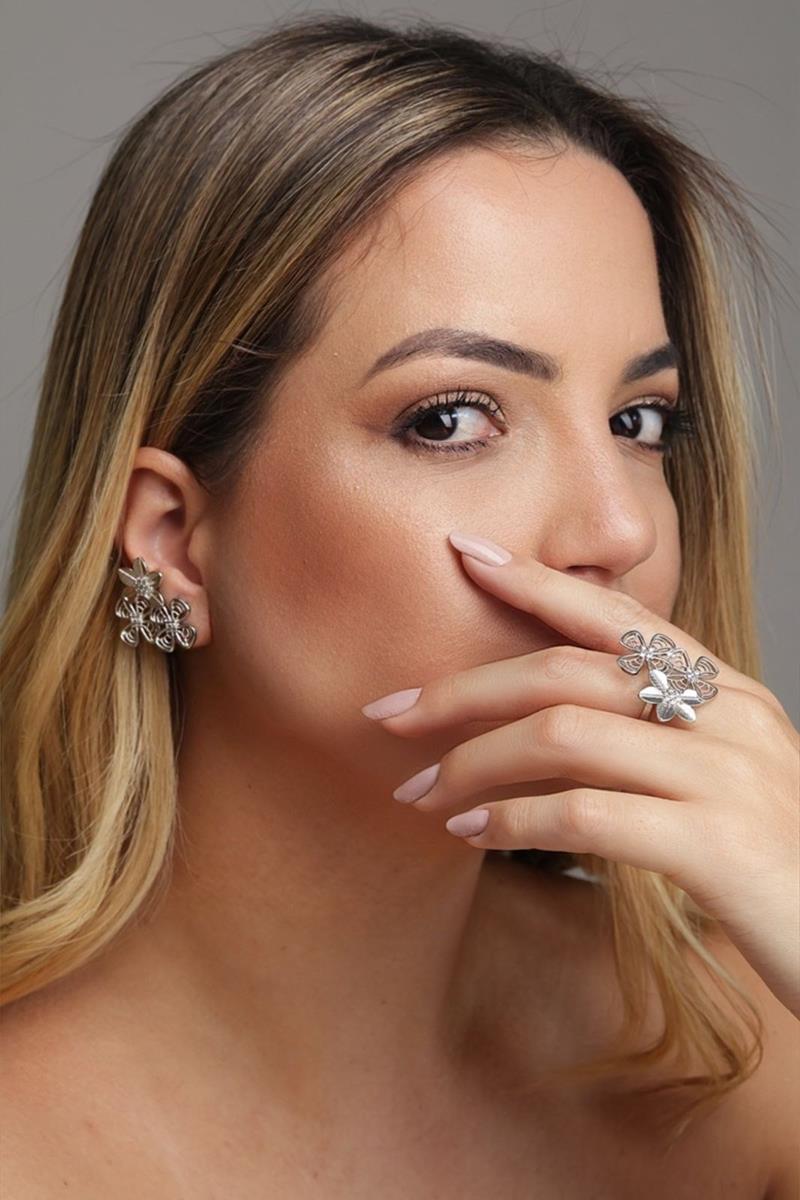 . O conjunto permite uma harmoniosa combinação entre o anel e os brincos, criando um visual coeso e elegante. É possível usá-los juntos para um look mais completo ou separadamente para um toque sutil.