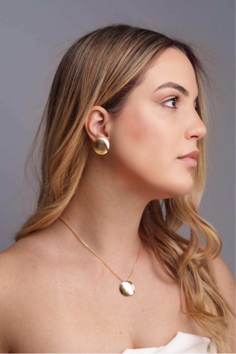 Conjunto de brinco e colar que transmite uma imagem de elegância e sofisticação atemporal, ideal para complementar tano looks casuais quanto para ocasiões especais.